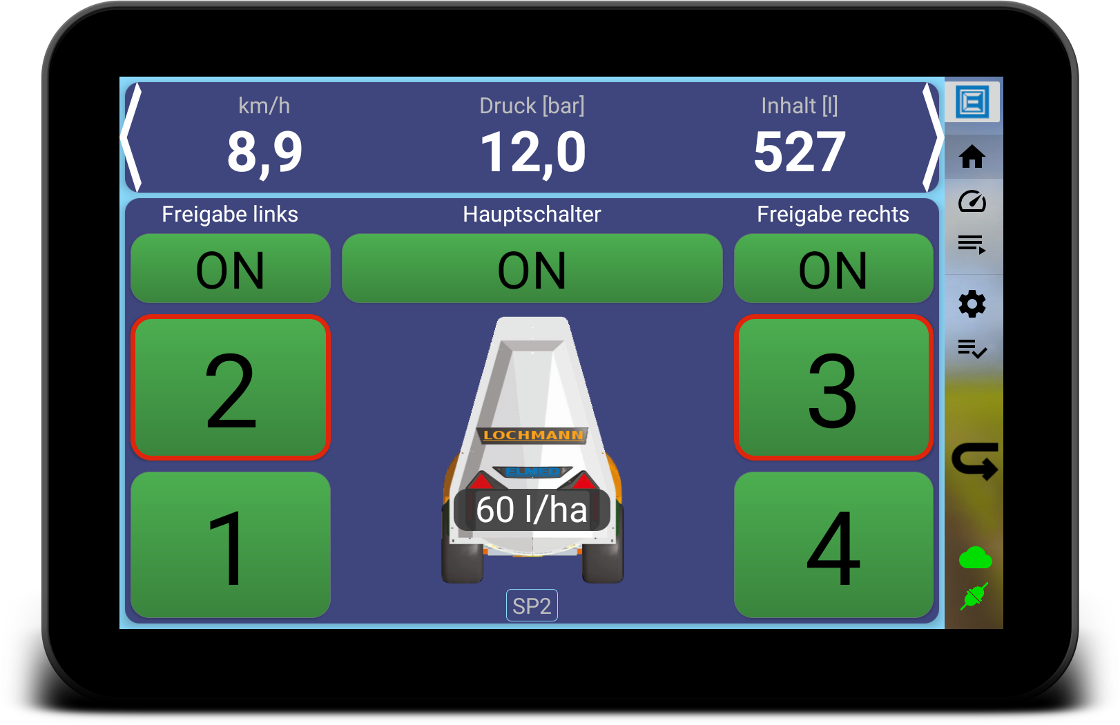 Der Joystick ist über Bluetooth mit dem SpgTab und über ein Kabel mit der SPG22 verbunden. Zustzlich kann das SpgTab an das SPT08 angeschlossen werden damit der Akku geladen wird. Durch die Kabellose Übertragung und den Akku können Sie das SpgTab auch in der näheren Umgebung des Sprühers bspw. zum Testen der Düsen oder beim Auffüllen des Tanks mit sich führen.
